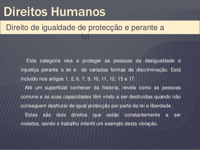 27. 27. Direitos HumanosDireito de igualdade de protecção e perante a lei Esta categoria visa a proteger as pessoas da desigualdade e injustiça perante a lei e de variadas formas de discriminação. Está incluído nos artigos 1, 2, 6, 7, 9, 10, 11, 12, 15 e 17. Até um superficial conhecer da historia, revela como as pessoas comuns e as suas capacidades têm vindo a ser destruídas quando não conseguem desfrutar de igual protecção por parte da lei e liberdade . Estes são dois direitos que estão constantemente a ser violados, sendo o trabalho infantil um exemplo desta violação.