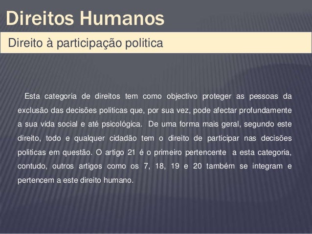 28. 28. Direitos HumanosDireito à participação politica Esta categoria de direitos tem como objectivo proteger as pessoas da exclusão das decisões politicas que, por sua vez, pode afectar profundamente a sua vida social e até psicológica. De uma forma mais geral, segundo este direito, todo e qualquer cidadão tem o direito de participar nas decisões politicas em questão. O artigo 21 é o primeiro pertencente a esta categoria, contudo, outros artigos como os 7, 18, 19 e 20 também se integram e pertencem a este direito humano.
