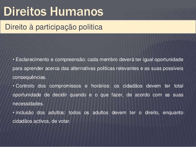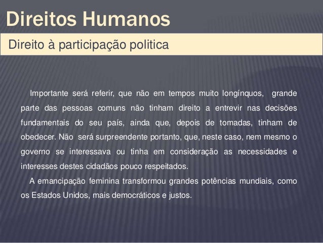 29. 29. Direitos HumanosDireito à participação politica Importante será referir, que não em tempos muito longínquos, grande parte das pessoas comuns não tinham direito a entrevir nas decisões fundamentais do seu país, ainda que, depois de tomadas, tinham de obedecer. Não será surpreendente portanto, que, neste caso, nem mesmo o governo se interessava ou tinha em consideração as necessidades e interesses destes cidadãos pouco respeitados. A emancipação feminina transformou grandes potências mundiais, como os Estados Unidos, mais democráticos e justos.