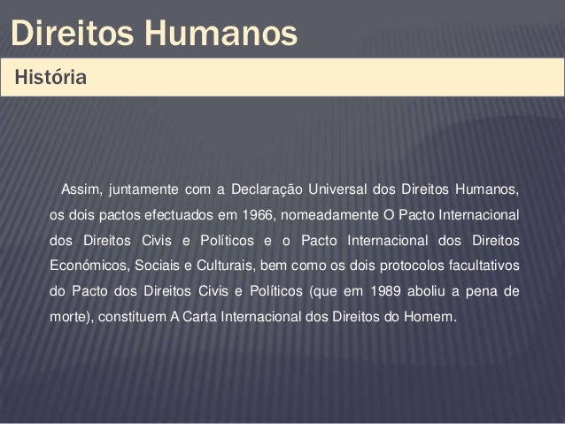 3. 3. Direitos HumanosHistória Assim, juntamente com a Declaração Universal dos Direitos Humanos, os dois pactos efectuados em 1966, nomeadamente O Pacto Internacional dos Direitos Civis e Políticos e o Pacto Internacional dos Direitos Económicos, Sociais e Culturais, bem como os dois protocolos facultativos do Pacto dos Direitos Civis e Políticos (que em 1989 aboliu a pena de morte), constituem A Carta Internacional dos Direitos do Homem.
