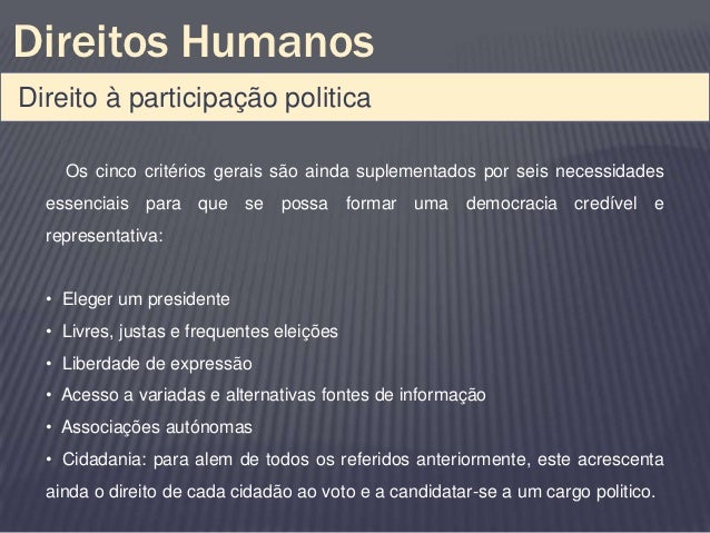 32. 32. Direitos HumanosDireito à participação politica Os cinco critérios gerais são ainda suplementados por seis necessidades essenciais para que se possa formar uma democracia credível e representativa: • Eleger um presidente • Livres, justas e frequentes eleições • Liberdade de expressão • Acesso a variadas e alternativas fontes de informação • Associações autónomas • Cidadania: para alem de todos os referidos anteriormente, este acrescenta ainda o direito de cada cidadão ao voto e a candidatar-se a um cargo politico.