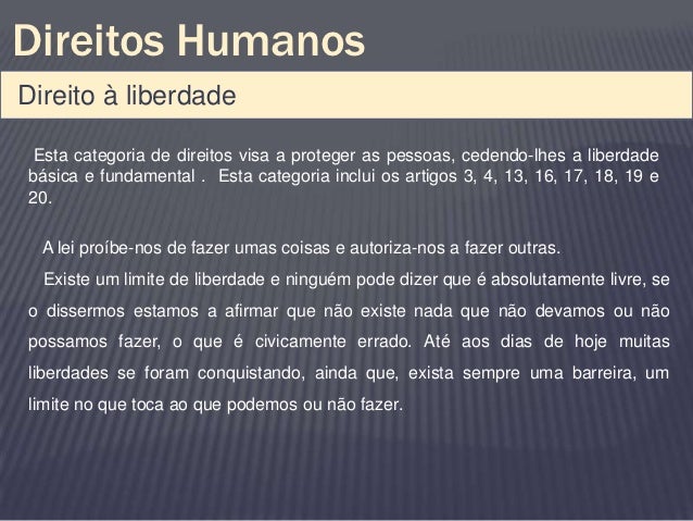 33. 33. Direitos HumanosDireito à liberdade Esta categoria de direitos visa a proteger as pessoas, cedendo-lhes a liberdadebásica e fundamental . Esta categoria inclui os artigos 3, 4, 13, 16, 17, 18, 19 e20. A lei proíbe-nos de fazer umas coisas e autoriza-nos a fazer outras. Existe um limite de liberdade e ninguém pode dizer que é absolutamente livre, seo dissermos estamos a afirmar que não existe nada que não devamos ou nãopossamos fazer, o que é civicamente errado. Até aos dias de hoje muitasliberdades se foram conquistando, ainda que, exista sempre uma barreira, umlimite no que toca ao que podemos ou não fazer.