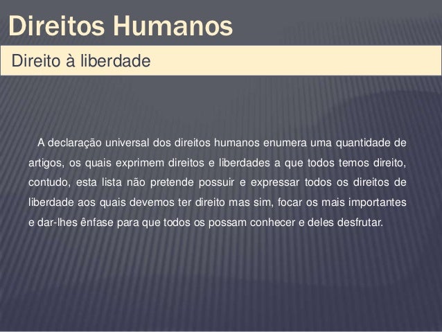 34. 34. Direitos HumanosDireito à liberdade A declaração universal dos direitos humanos enumera uma quantidade de artigos, os quais exprimem direitos e liberdades a que todos temos direito, contudo, esta lista não pretende possuir e expressar todos os direitos de liberdade aos quais devemos ter direito mas sim, focar os mais importantes e dar-lhes ênfase para que todos os possam conhecer e deles desfrutar.