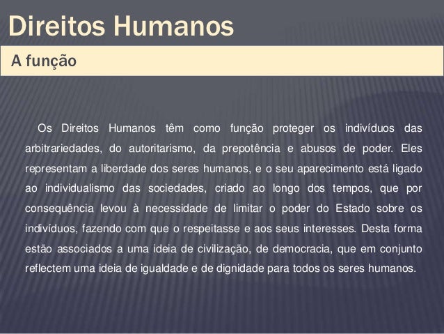 35. 35. Direitos HumanosA função Os Direitos Humanos têm como função proteger os indivíduos das arbitrariedades, do autoritarismo, da prepotência e abusos de poder. Eles representam a liberdade dos seres humanos, e o seu aparecimento está ligado ao individualismo das sociedades, criado ao longo dos tempos, que por consequência levou à necessidade de limitar o poder do Estado sobre os indivíduos, fazendo com que o respeitasse e aos seus interesses. Desta forma estão associados a uma ideia de civilização, de democracia, que em conjunto reflectem uma ideia de igualdade e de dignidade para todos os seres humanos.