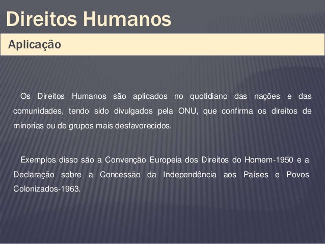 37. 37. Direitos HumanosAplicação Os Direitos Humanos são aplicados no quotidiano das nações e dascomunidades, tendo sido divulgados pela ONU, que confirma os direitos deminorias ou de grupos mais desfavorecidos. Exemplos disso são a Convenção Europeia dos Direitos do Homem-1950 e aDeclaração sobre a Concessão da Independência aos Países e PovosColonizados-1963.