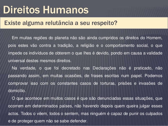 40. 40. Direitos HumanosExiste alguma relutância a seu respeito? Em muitas regiões do planeta não são ainda cumpridos os direitos do Homem, pois estes vão contra a tradição, a religião e o comportamento social, o que impede os indivíduos de obterem o que lhes é devido, pondo em causa a validade universal destes mesmos direitos. Na verdade, o que foi decretado nas Declarações não é praticado, não passando assim, em muitas ocasiões, de frases escritas num papel. Podemos comprovar isso com os constantes casos de torturas, prisões e invasões de domicílio. O que acontece em muitos casos é que são denunciadas essas situações, que ocorrem em determinados países, não havendo depois quem queira julgar esses actos. Todos o vêem, todos o sentem, mas ninguém é capaz de punir os culpados e de proteger quem não se sabe defender.