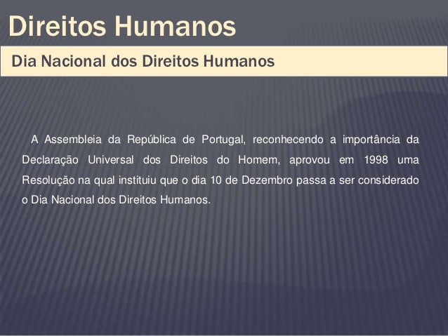 41. 41. Direitos HumanosDia Nacional dos Direitos Humanos A Assembleia da República de Portugal, reconhecendo a importância da Declaração Universal dos Direitos do Homem, aprovou em 1998 uma Resolução na qual instituiu que o dia 10 de Dezembro passa a ser considerado o Dia Nacional dos Direitos Humanos.