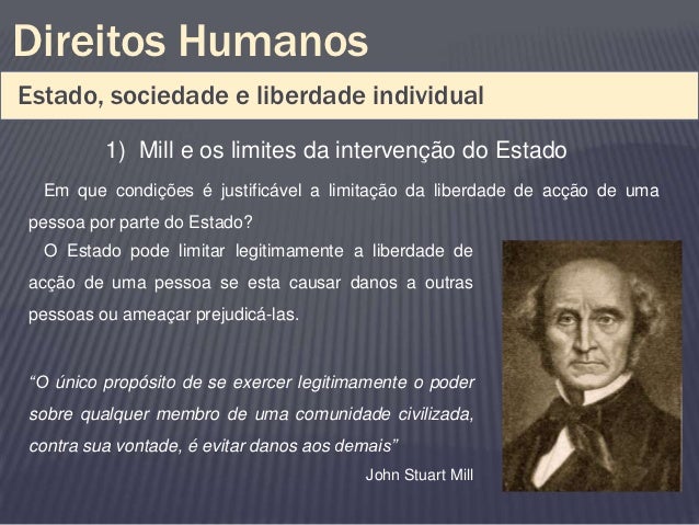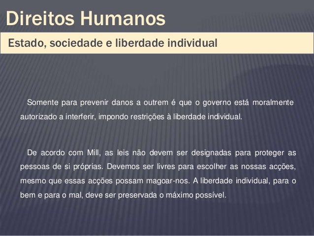 43. 43. Direitos HumanosEstado, sociedade e liberdade individual Somente para prevenir danos a outrem é que o governo está moralmente autorizado a interferir, impondo restrições à liberdade individual. De acordo com Mill, as leis não devem ser designadas para proteger as pessoas de si próprias. Devemos ser livres para escolher as nossas acções, mesmo que essas acções possam magoar-nos. A liberdade individual, para o bem e para o mal, deve ser preservada o máximo possível.