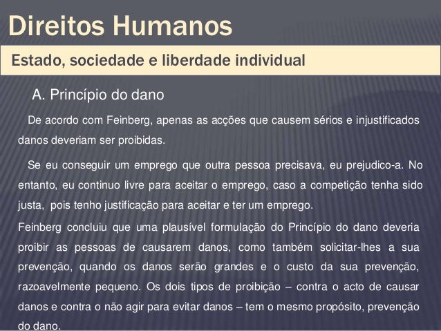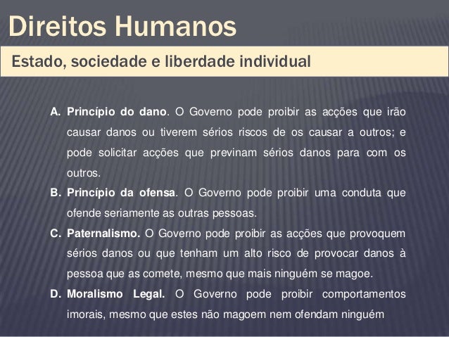 45. 45. Direitos HumanosEstado, sociedade e liberdade individual A. Princípio do dano. O Governo pode proibir as acções que irão causar danos ou tiverem sérios riscos de os causar a outros; e pode solicitar acções que previnam sérios danos para com os outros. B. Princípio da ofensa. O Governo pode proibir uma conduta que ofende seriamente as outras pessoas. C. Paternalismo. O Governo pode proibir as acções que provoquem sérios danos ou que tenham um alto risco de provocar danos à pessoa que as comete, mesmo que mais ninguém se magoe. D. Moralismo Legal. O Governo pode proibir comportamentos imorais, mesmo que estes não magoem nem ofendam ninguém