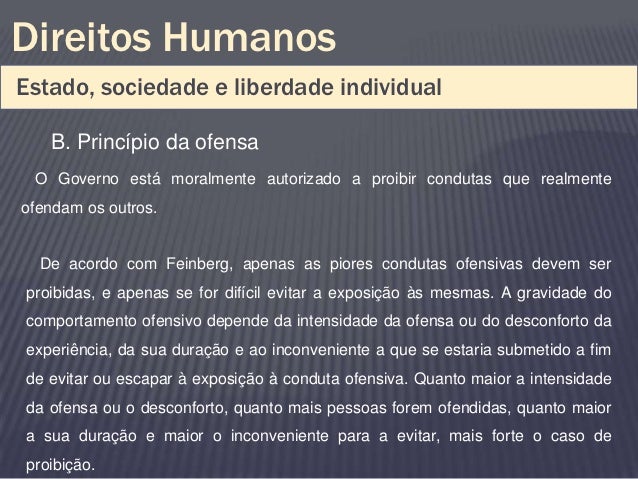 47. 47. Direitos HumanosEstado, sociedade e liberdade individual B. Princípio da ofensa O Governo está moralmente autorizado a proibir condutas que realmenteofendam os outros. De acordo com Feinberg, apenas as piores condutas ofensivas devem serproibidas, e apenas se for difícil evitar a exposição às mesmas. A gravidade docomportamento ofensivo depende da intensidade da ofensa ou do desconforto daexperiência, da sua duração e ao inconveniente a que se estaria submetido a fimde evitar ou escapar à exposição à conduta ofensiva. Quanto maior a intensidadeda ofensa ou o desconforto, quanto mais pessoas forem ofendidas, quanto maiora sua duração e maior o inconveniente para a evitar, mais forte o caso deproibição.