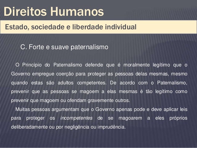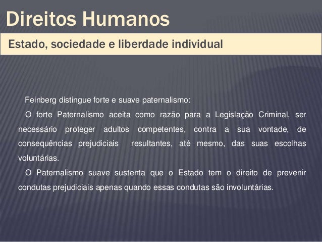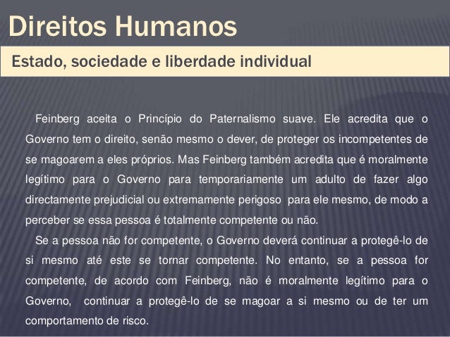 50. 50. Direitos HumanosEstado, sociedade e liberdade individual Feinberg aceita o Princípio do Paternalismo suave. Ele acredita que o Governo tem o direito, senão mesmo o dever, de proteger os incompetentes de se magoarem a eles próprios. Mas Feinberg também acredita que é moralmente legítimo para o Governo para temporariamente um adulto de fazer algo directamente prejudicial ou extremamente perigoso para ele mesmo, de modo a perceber se essa pessoa é totalmente competente ou não. Se a pessoa não for competente, o Governo deverá continuar a protegê-lo de si mesmo até este se tornar competente. No entanto, se a pessoa for competente, de acordo com Feinberg, não é moralmente legítimo para o Governo, continuar a protegê-lo de se magoar a si mesmo ou de ter um comportamento de risco.