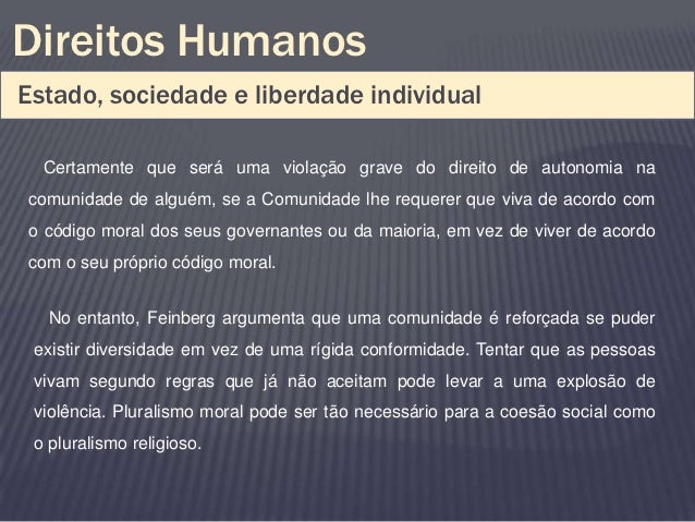 52. 52. Direitos HumanosEstado, sociedade e liberdade individual Certamente que será uma violação grave do direito de autonomia nacomunidade de alguém, se a Comunidade lhe requerer que viva de acordo como código moral dos seus governantes ou da maioria, em vez de viver de acordocom o seu próprio código moral. No entanto, Feinberg argumenta que uma comunidade é reforçada se puder existir diversidade em vez de uma rígida conformidade. Tentar que as pessoas vivam segundo regras que já não aceitam pode levar a uma explosão de violência. Pluralismo moral pode ser tão necessário para a coesão social como o pluralismo religioso.