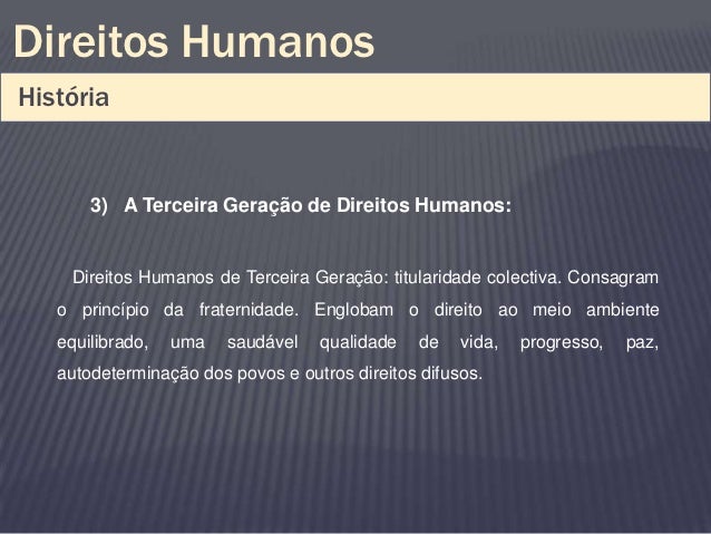 6. 6. Direitos HumanosHistória 3) A Terceira Geração de Direitos Humanos: Direitos Humanos de Terceira Geração: titularidade colectiva. Consagram o princípio da fraternidade. Englobam o direito ao meio ambiente equilibrado, uma saudável qualidade de vida, progresso, paz, autodeterminação dos povos e outros direitos difusos.