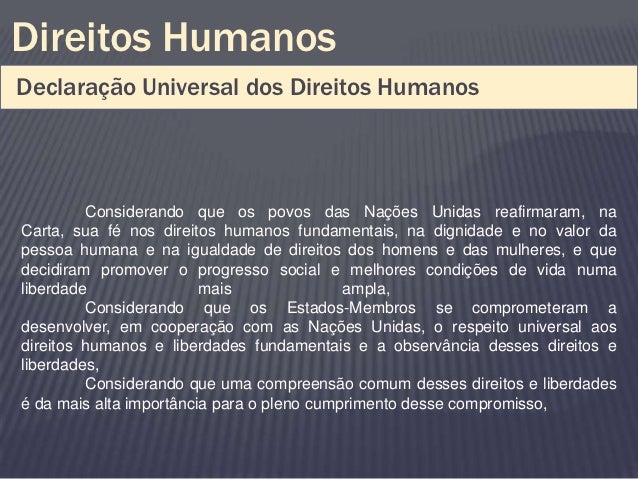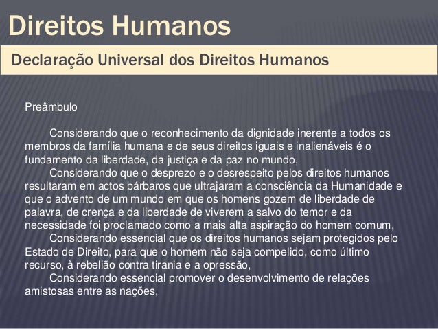 8. 8. Direitos HumanosDeclaração Universal dos Direitos Humanos Preâmbulo Considerando que o reconhecimento da dignidade inerente a todos os membros da família humana e de seus direitos iguais e inalienáveis é o fundamento da liberdade, da justiça e da paz no mundo, Considerando que o desprezo e o desrespeito pelos direitos humanos resultaram em actos bárbaros que ultrajaram a consciência da Humanidade e que o advento de um mundo em que os homens gozem de liberdade de palavra, de crença e da liberdade de viverem a salvo do temor e da necessidade foi proclamado como a mais alta aspiração do homem comum, Considerando essencial que os direitos humanos sejam protegidos pelo Estado de Direito, para que o homem não seja compelido, como último recurso, à rebelião contra tirania e a opressão, Considerando essencial promover o desenvolvimento de relações amistosas entre as nações,