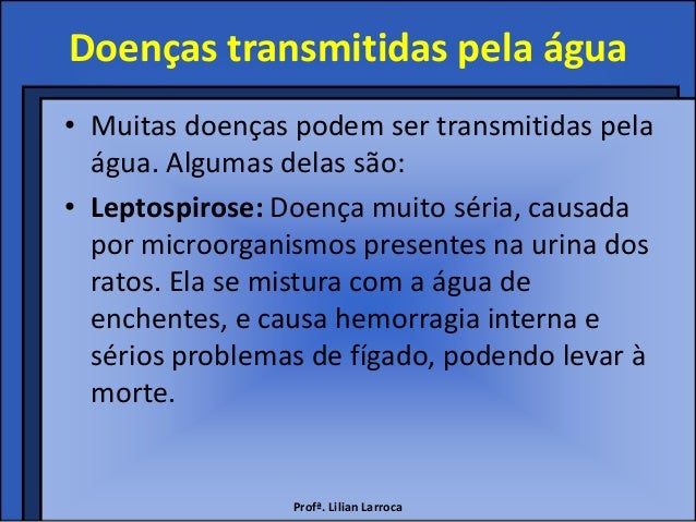 11. 11. Doenças transmitidas pela água• Muitas doenças podem ser transmitidas pela água. Algumas delas são:• Leptospirose: Doença muito séria, causada por microorganismos presentes na urina dos ratos. Ela se mistura com a água de enchentes, e causa hemorragia interna e sérios problemas de fígado, podendo levar à morte. Profª. Lilian Larroca