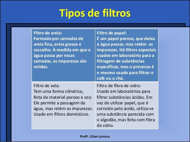 13. 13. Tipos de filtrosFiltro de areia: Filtro de papel:Formado por camadas de É um papel poroso, que deixaareia fina, areia grossa e a água passar, mas retém ascascalho. À medida em que a impurezas. Há filtros especiaiságua passa por essas usados em laboratório para acamadas, as impurezas são filtragem de substânciasretidas. específicas, mas o processo é o mesmo usado para filtrar o café ou o chá.Filtro de vela: Filtro de fibra de vidro:Tem uma forma cilíndrica, Usado em laboratórios parafeita de material poroso e oco. filtrar substâncias ácidas. EmEle permite a passagem da vez de utilizar papel, que éágua, mas retém as impurezas. corroído pelo ácido, utiliza-seUsado em filtros domésticos. uma substância parecida com o algodão, mas feita com fibra de vidro. Profª. Lilian Larroca