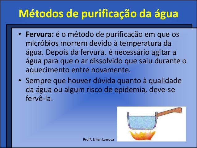 15. 15. Métodos de purificação da água• Fervura: é o método de purificação em que os micróbios morrem devido à temperatura da água. Depois da fervura, é necessário agitar a água para que o ar dissolvido que saiu durante o aquecimento entre novamente.• Sempre que houver dúvida quanto à qualidade da água ou algum risco de epidemia, deve-se fervê-la. Profª. Lilian Larroca