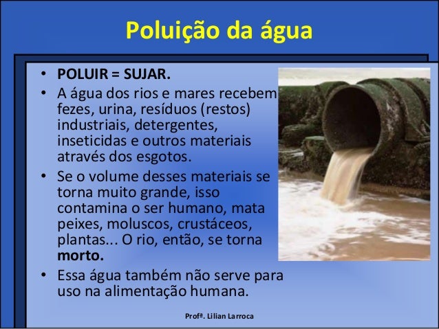 3. 3. Poluição da água• POLUIR = SUJAR.• A água dos rios e mares recebem fezes, urina, resíduos (restos) industriais, detergentes, inseticidas e outros materiais através dos esgotos.• Se o volume desses materiais se torna muito grande, isso contamina o ser humano, mata peixes, moluscos, crustáceos, plantas... O rio, então, se torna morto.• Essa água também não serve para uso na alimentação humana. Profª. Lilian Larroca