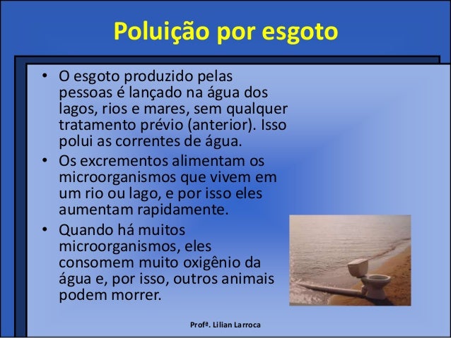 4. 4. Poluição por esgoto• O esgoto produzido pelas pessoas é lançado na água dos lagos, rios e mares, sem qualquer tratamento prévio (anterior). Isso polui as correntes de água.• Os excrementos alimentam os microorganismos que vivem em um rio ou lago, e por isso eles aumentam rapidamente.• Quando há muitos microorganismos, eles consomem muito oxigênio da água e, por isso, outros animais podem morrer. Profª. Lilian Larroca