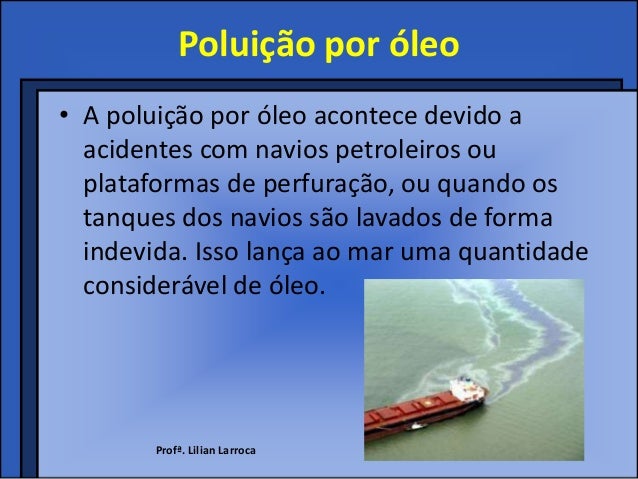 6. 6. Poluição por óleo• A poluição por óleo acontece devido a acidentes com navios petroleiros ou plataformas de perfuração, ou quando os tanques dos navios são lavados de forma indevida. Isso lança ao mar uma quantidade considerável de óleo. Profª. Lilian Larroca