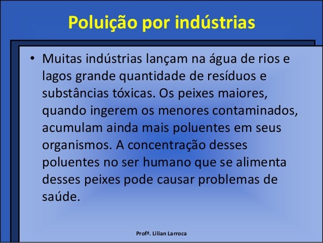 7. 7. Poluição por indústrias• Muitas indústrias lançam na água de rios e lagos grande quantidade de resíduos e substâncias tóxicas. Os peixes maiores, quando ingerem os menores contaminados, acumulam ainda mais poluentes em seus organismos. A concentração desses poluentes no ser humano que se alimenta desses peixes pode causar problemas de saúde. Profª. Lilian Larroca