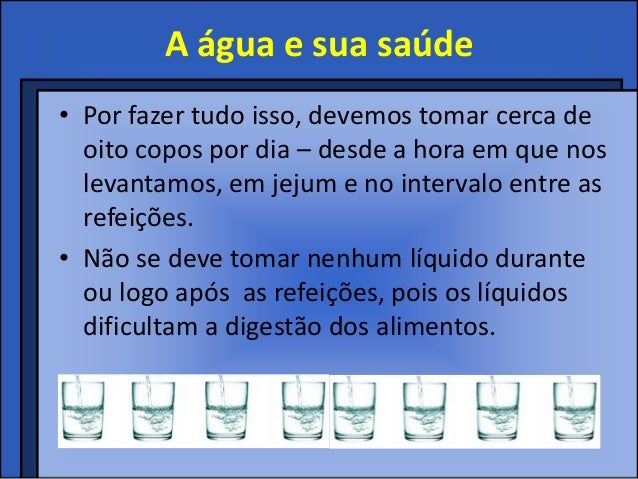 9. 9. A água e sua saúde• Por fazer tudo isso, devemos tomar cerca de oito copos por dia – desde a hora em que nos levantamos, em jejum e no intervalo entre as refeições.• Não se deve tomar nenhum líquido durante ou logo após as refeições, pois os líquidos dificultam a digestão dos alimentos.