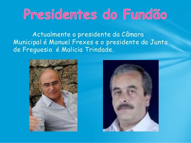 8. 8. Actualmente o presidente da Câmara Municipal é Manuel Frexes e o presidente da Junta de Freguesia é Malicia Trindade.