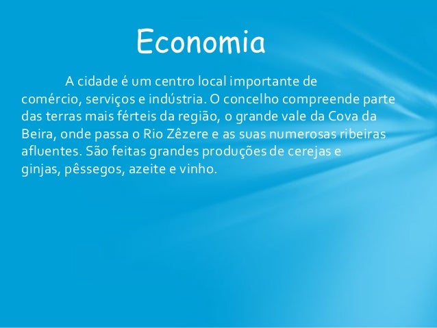 11. 11. A cidade é um centro local importante de comércio, serviços e indústria. O concelho compreende parte das terras mais férteis da região, o grande vale da Cova da Beira, onde passa o Rio Zêzere e as suas numerosas ribeiras afluentes. São feitas grandes produções de cerejas e ginjas, pêssegos, azeite e vinho. Economia