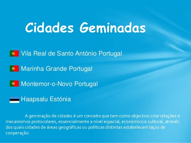 12. 12. Cidades Geminadas Vila Real de Santo António Portugal Marinha Grande Portugal Montemor-o-Novo Portugal Haapsalu Estónia A geminação de cidades é um conceito que tem como objectivo criar relações e mecanismos protocolares, essencialmente a nível espacial, económico e cultural, através dos quais cidades de áreas geográficas ou políticas distintas estabelecem laços de cooperação.