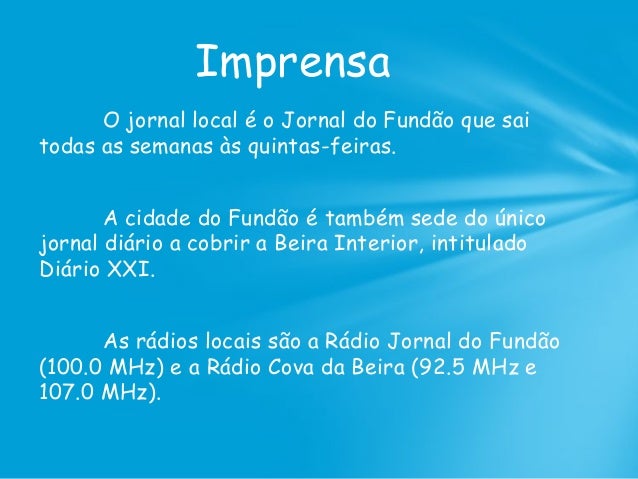 13. 13. O jornal local é o Jornal do Fundão que sai todas as semanas às quintas-feiras. A cidade do Fundão é também sede do único jornal diário a cobrir a Beira Interior, intitulado Diário XXI. As rádios locais são a Rádio Jornal do Fundão (100.0 MHz) e a Rádio Cova da Beira (92.5 MHz e 107.0 MHz). Imprensa