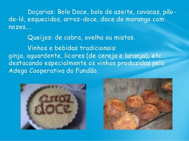 15. 15. Doçarias: Bolo Doce, bolo de azeite, cavacas, pão- de-ló, esquecidos, arroz-doce, doce de morango com nozes,… Queijos: de cabra, ovelha ou mistos. Vinhos e bebidas tradicionais: ginja, aguardente, licores (de cereja e laranja), etc... destacando especialmente os vinhos produzidos pela Adega Cooperativa do Fundão.