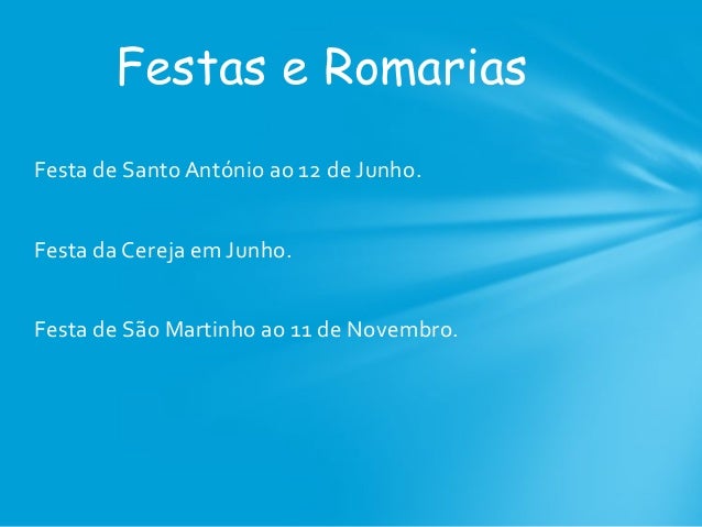16. 16. Festa de Santo António ao 12 de Junho. Festa da Cereja em Junho. Festa de São Martinho ao 11 de Novembro. Festas e Romarias