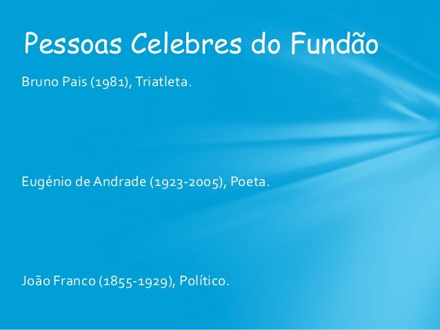 18. 18. Bruno Pais (1981), Triatleta. Eugénio de Andrade (1923-2005), Poeta. João Franco (1855-1929), Político. Pessoas Celebres do Fundão