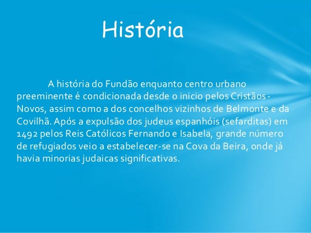 2. 2. A história do Fundão enquanto centro urbano preeminente é condicionada desde o inicio pelos Cristãos- Novos, assim como a dos concelhos vizinhos de Belmonte e da Covilhã. Após a expulsão dos judeus espanhóis (sefarditas) em 1492 pelos Reis Católicos Fernando e Isabela, grande número de refugiados veio a estabelecer-se na Cova da Beira, onde já havia minorias judaicas significativas. História