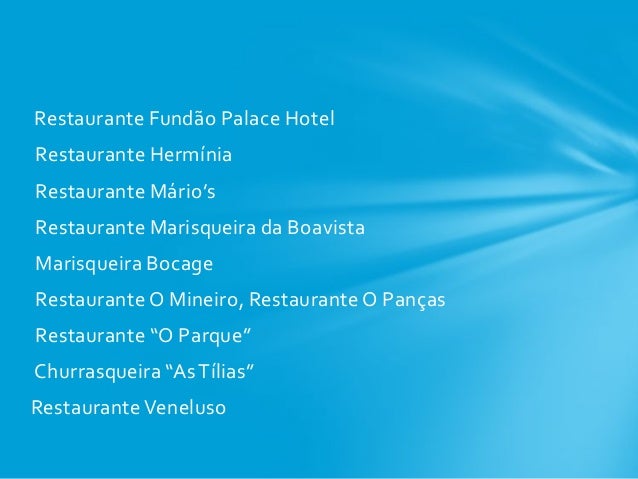 33. 33. Restaurante Fundão Palace Hotel Restaurante Hermínia Restaurante Mário’s Restaurante Marisqueira da Boavista Marisqueira Bocage Restaurante O Mineiro, Restaurante O Panças Restaurante “O Parque” Churrasqueira “As Tílias” RestauranteVeneluso
