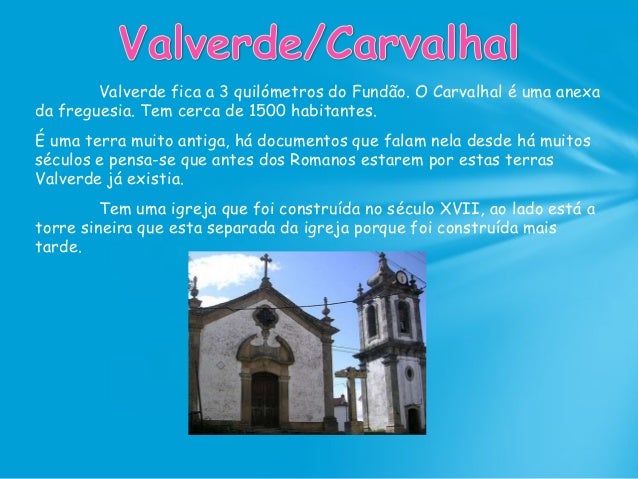 35. 35. Valverde fica a 3 quilómetros do Fundão. O Carvalhal é uma anexa da freguesia. Tem cerca de 1500 habitantes. É uma terra muito antiga, há documentos que falam nela desde há muitos séculos e pensa-se que antes dos Romanos estarem por estas terras Valverde já existia. Tem uma igreja que foi construída no século XVII, ao lado está a torre sineira que esta separada da igreja porque foi construída mais tarde.