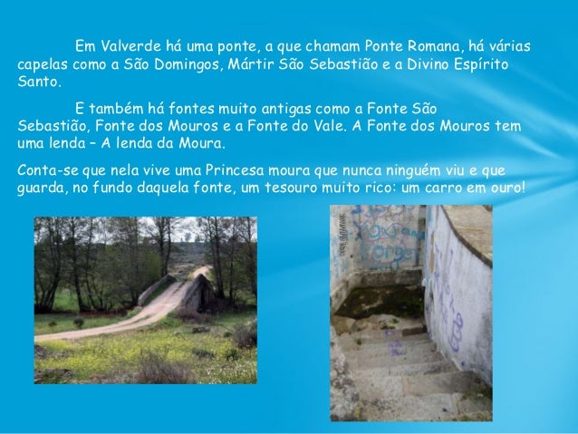 36. 36. Em Valverde há uma ponte, a que chamam Ponte Romana, há várias capelas como a São Domingos, Mártir São Sebastião e a Divino Espírito Santo. E também há fontes muito antigas como a Fonte São Sebastião, Fonte dos Mouros e a Fonte do Vale. A Fonte dos Mouros tem uma lenda – A lenda da Moura. Conta-se que nela vive uma Princesa moura que nunca ninguém viu e que guarda, no fundo daquela fonte, um tesouro muito rico: um carro em ouro!