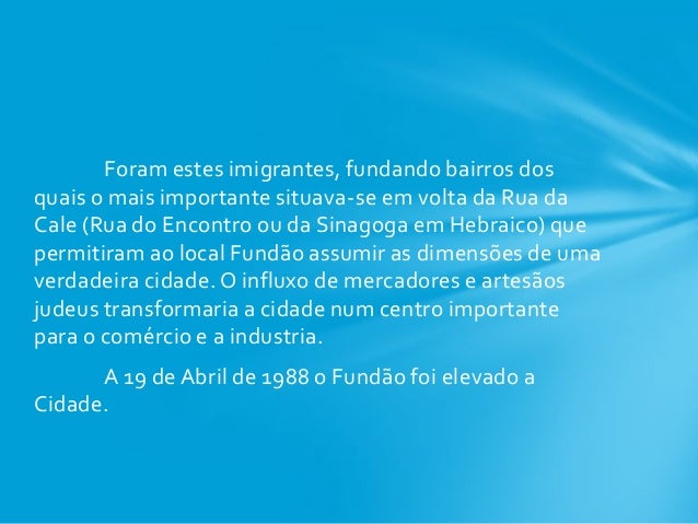3. 3. Foram estes imigrantes, fundando bairros dos quais o mais importante situava-se em volta da Rua da Cale (Rua do Encontro ou da Sinagoga em Hebraico) que permitiram ao local Fundão assumir as dimensões de uma verdadeira cidade. O influxo de mercadores e artesãos judeus transformaria a cidade num centro importante para o comércio e a industria. A 19 de Abril de 1988 o Fundão foi elevado a Cidade.