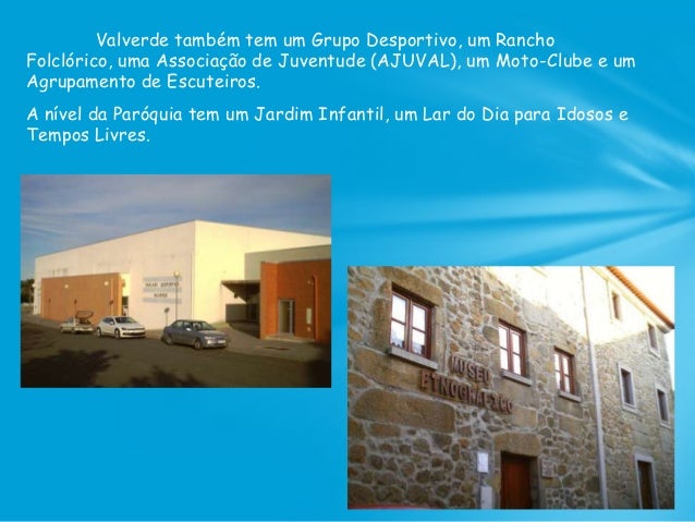 38. 38. Valverde também tem um Grupo Desportivo, um Rancho Folclórico, uma Associação de Juventude (AJUVAL), um Moto-Clube e um Agrupamento de Escuteiros. A nível da Paróquia tem um Jardim Infantil, um Lar do Dia para Idosos e Tempos Livres.