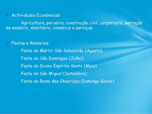 39. 39.  Actividades Económicas: Agricultura, pecuária, construção civil, carpintaria, serração de madeira, mobiliário, comércio e serviços.  Festas e Romarias: Festa do Mártir São Sebastião (Agosto) Festa de São Domingos (Julho) Festa do Divino Espírito Santo (Maio) Festa de São Miguel (Setembro) Festa do Ramo das Chouriças (Domingo Gordo)