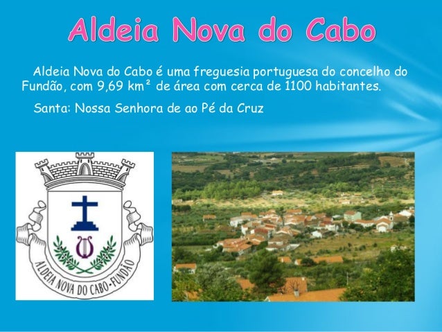 41. 41. Aldeia Nova do Cabo é uma freguesia portuguesa do concelho do Fundão, com 9,69 km² de área com cerca de 1100 habitantes. Santa: Nossa Senhora de ao Pé da Cruz