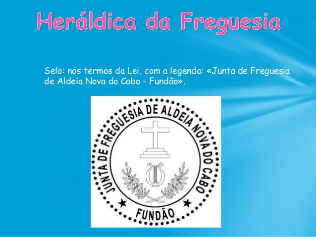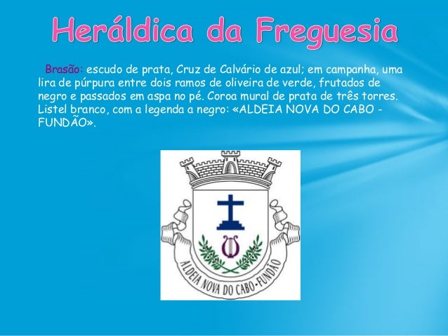 42. 42. Brasão: escudo de prata, Cruz de Calvário de azul; em campanha, uma lira de púrpura entre dois ramos de oliveira de verde, frutados de negro e passados em aspa no pé. Coroa mural de prata de três torres. Listel branco, com a legenda a negro: «ALDEIA NOVA DO CABO - FUNDÃO».