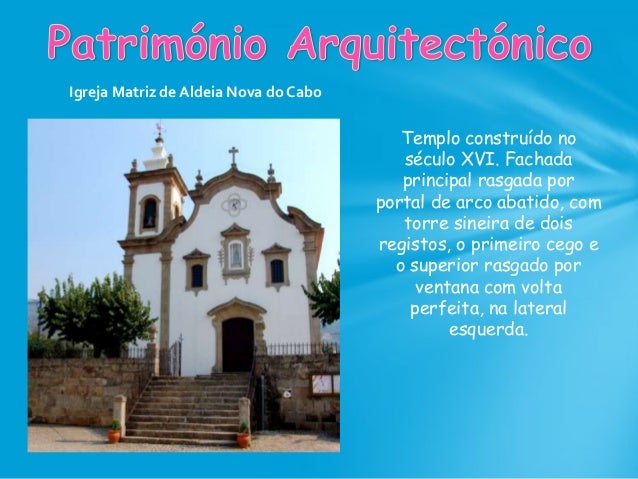 45. 45. Igreja Matriz de Aldeia Nova do Cabo Templo construído no século XVI. Fachada principal rasgada por portal de arco abatido, com torre sineira de dois registos, o primeiro cego e o superior rasgado por ventana com volta perfeita, na lateral esquerda.