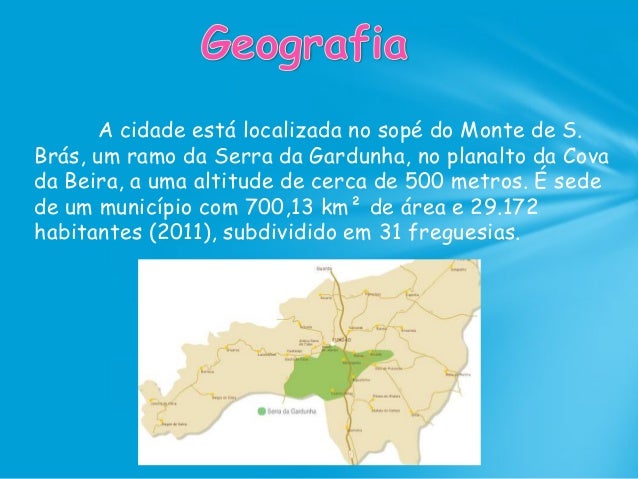 4. 4. A cidade está localizada no sopé do Monte de S. Brás, um ramo da Serra da Gardunha, no planalto da Cova da Beira, a uma altitude de cerca de 500 metros. É sede de um município com 700,13 km² de área e 29.172 habitantes (2011), subdividido em 31 freguesias.