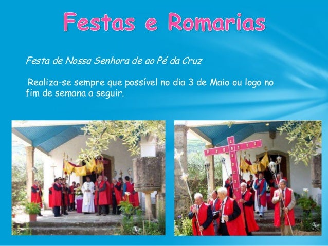 53. 53. Festa de Nossa Senhora de ao Pé da Cruz Realiza-se sempre que possível no dia 3 de Maio ou logo no fim de semana a seguir.