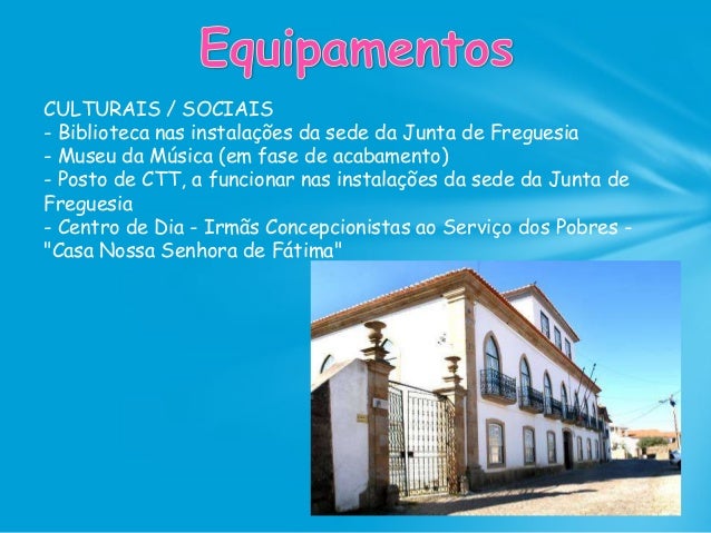 56. 56. CULTURAIS / SOCIAIS - Biblioteca nas instalações da sede da Junta de Freguesia - Museu da Música (em fase de acabamento) - Posto de CTT, a funcionar nas instalações da sede da Junta de Freguesia - Centro de Dia - Irmãs Concepcionistas ao Serviço dos Pobres - "Casa Nossa Senhora de Fátima"