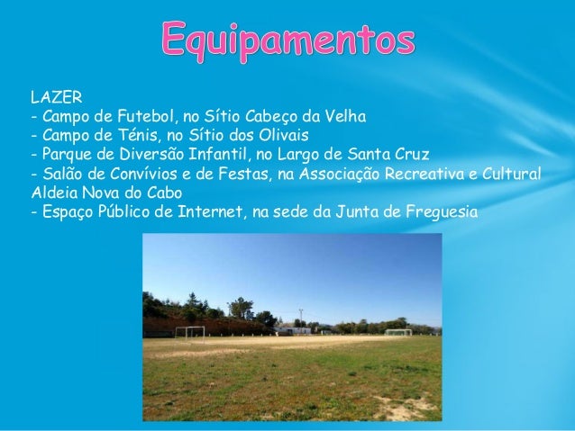 57. 57. LAZER - Campo de Futebol, no Sítio Cabeço da Velha - Campo de Ténis, no Sítio dos Olivais - Parque de Diversão Infantil, no Largo de Santa Cruz - Salão de Convívios e de Festas, na Associação Recreativa e Cultural Aldeia Nova do Cabo - Espaço Público de Internet, na sede da Junta de Freguesia