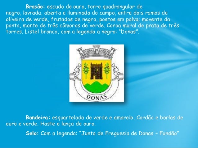 59. 59. Brasão: escudo de ouro, torre quadrangular de negro, lavrada, aberta e iluminada do campo, entre dois ramos de oliveira de verde, frutados de negro, postos em palva; movente da ponta, monte de três cômoros de verde. Coroa mural de prata de três torres. Listel branco, com a legenda a negro: “Donas”. Bandeira: esquartelada de verde e amarelo. Cordão e borlas de ouro e verde. Haste e lança de ouro. Selo: Com a legenda: “Junta de Freguesia de Donas – Fundão”