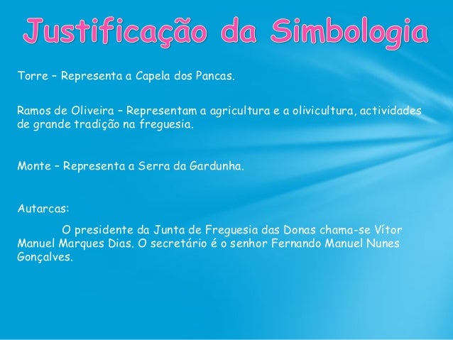 60. 60. Torre – Representa a Capela dos Pancas. Ramos de Oliveira – Representam a agricultura e a olivicultura, actividades de grande tradição na freguesia. Monte – Representa a Serra da Gardunha. Autarcas: O presidente da Junta de Freguesia das Donas chama-se Vítor Manuel Marques Dias. O secretário é o senhor Fernando Manuel Nunes Gonçalves.
