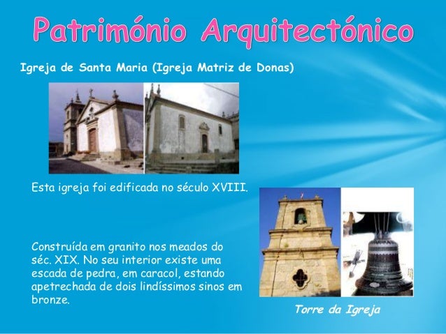 61. 61. Igreja de Santa Maria (Igreja Matriz de Donas) Esta igreja foi edificada no século XVIII. Torre da Igreja Construída em granito nos meados do séc. XIX. No seu interior existe uma escada de pedra, em caracol, estando apetrechada de dois lindíssimos sinos em bronze.
